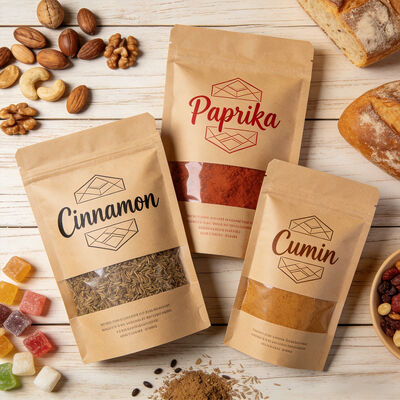 Compostable Eco Kraft Paper Ziplock Bag with Window Custom Pattern Food Packaging. Premium biodegradable food grade kraft paper pouches featuring convenient ziplock resealable closure and stand-up design. Perfect for coffee, nuts, snacks, spices, and various food products. Available for cross-border wholesale with custom printing options.