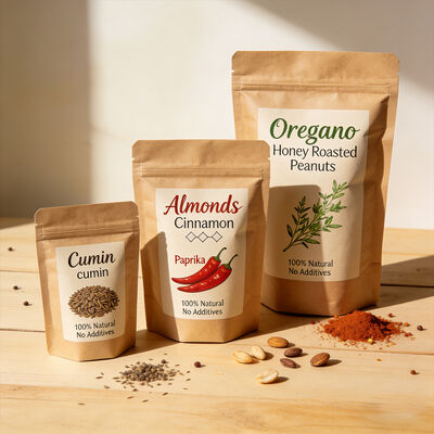 Premium biodegradable food grade kraft paper pouches featuring convenient ziplock resealable closure and stand-up design. Perfect for coffee, nuts, snacks, spices, and various food products. Available for cross-border wholesale with custom printing options.